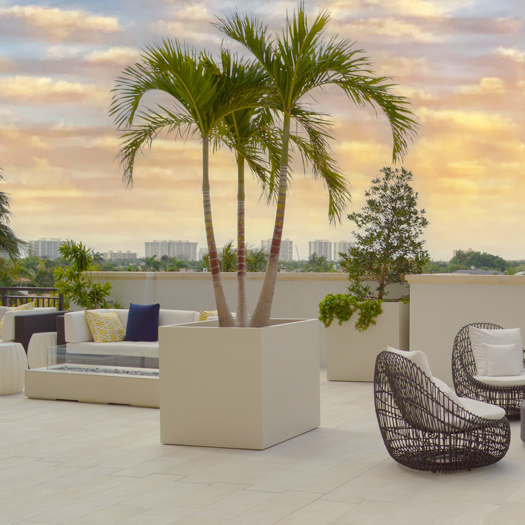 Because this model is part of the Potsdam family of tall square planters, it’s perfect for linear runs that turn a corner without breaking the design line. Use two at the corner and continue with matching rectangles along each side for a continuous, architectural edge.